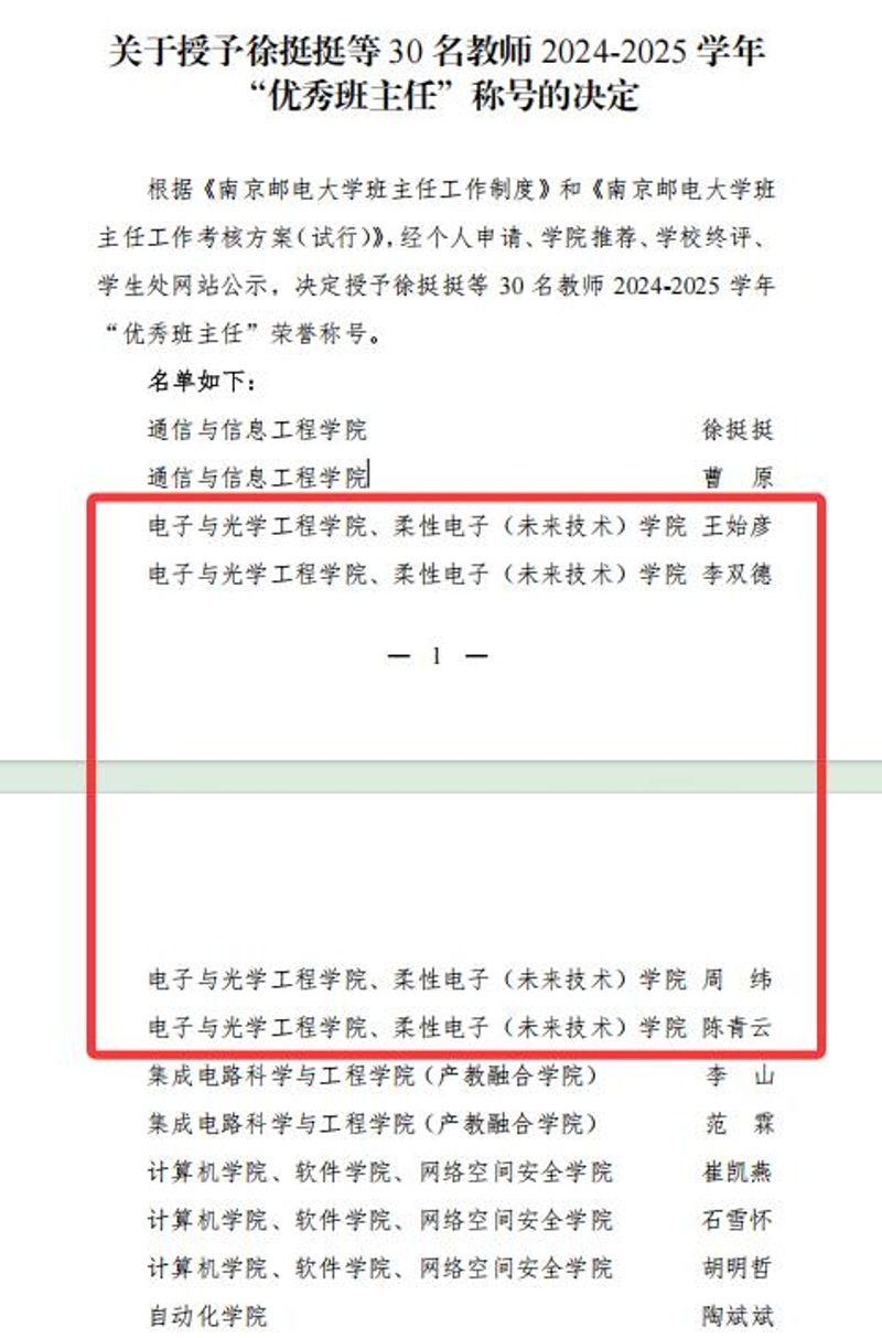 近日,南京郵電大學2024-2025學年“優(yōu)秀班主任”評選結果正式揭曉。全校共30位教師獲此殊榮,其中,電子與光學工程學院、柔性電子(未來技術)學院共有四位教師光榮入選,分別是王始彥、李雙德、周緯、陳青云。本次評選注重學生的真實反饋,根據“學生評價情況”(即班主任工作測評分數)和班主任提交的各類履職材料,對各位班主任老師的履職情況進行綜合評定,最終擇優(yōu)入選。電光柔院此次能夠有四位教師脫穎而出,榮獲校級“優(yōu)秀班主任”稱號,是學校對學院班主任工作整體水平和育人實效的高度認可。入選老師在日常工作中,始終堅守育人初心,恪盡職守,在思想引領、學業(yè)指導、生涯規(guī)劃、班級管理等方面傾注了大量心力,贏得了學生一致好評。此次優(yōu)異成績的取得是學院長期以來堅持立德樹人根本任務、不斷加強和改進班主任工作的成果體現(xiàn)。電光柔院將以此為契機,持續(xù)深化班主任隊伍建設,充分發(fā)揮優(yōu)秀班主任的示范引領作用,不斷探索學生工作的新思路、新方法,努力提升人才培養(yǎng)質量,為學生的全面成長成才和學校的高質量發(fā)展做出更大貢獻。撰稿:祝騰審核:徐磊編輯:祝騰